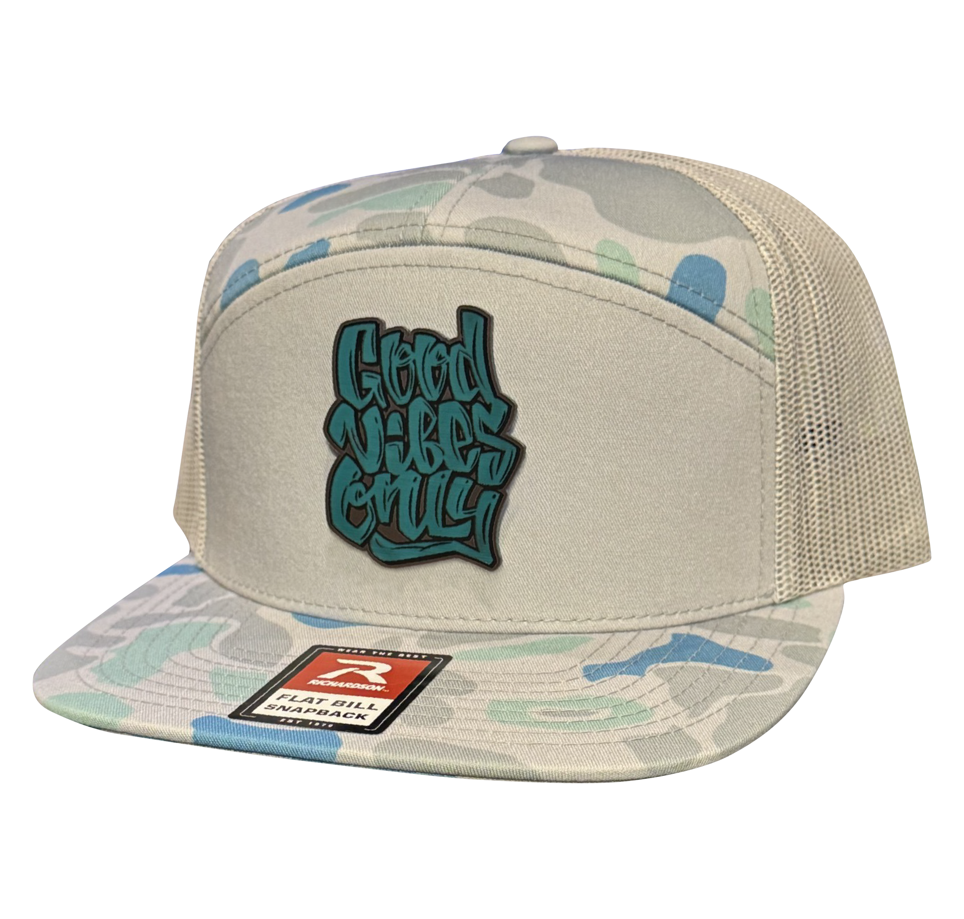This Good Vibes Only lid is a statement piece from the Summer Lovin collection, built on a premium 7-panel Saltwater Camo base that brings the chill of the ocean to your everyday fit. Front and center is an exquisitely unique tri-color acrylic patch featuring copper, turquoise, and black—layered in a graffiti-inspired design that turns heads and spreads nothing but positive energy. It’s the perfect mix of laid-back attitude and bold expression for anyone chasing sun, surf, and good times.